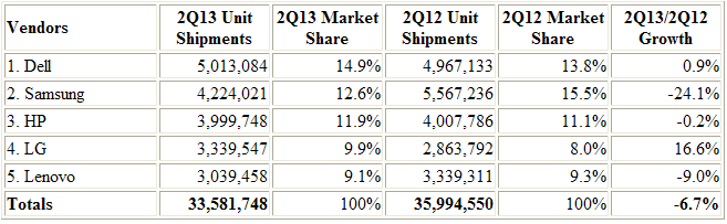 Как утверждает агентство IDC , компании Dell в минувшем квартале удалось впервые с 2007 года занять место лидера на мировом рынке мониторов, обогнав Samsung. Всего за период Dell удалось продать более 5 млн. мониторов, а занимаемая компанией доля рынка увеличилась за год с 13,8% до 14,9%. И хотя конкурирующая Samsung за год уменьшила количество проданных во втором квартале мониторов на 24,1%, в показателях выручки корейский производитель остаётся мировым лидером. Другими словами, Dell ради увеличения доли рынка пошла на снижение цен.