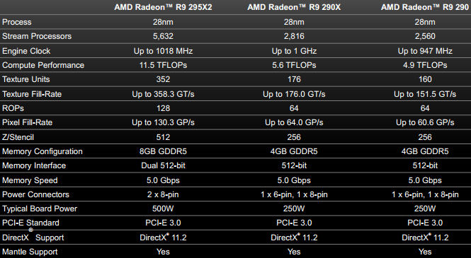 На печатной плате Radeon R9 295X2 размещено два GPU с кодовым именем Hawaii, каждый из которых насчитывает 2816 потоковых процессоров. В общей сложности, оба GPU включают 5632 потоковых процессора и насчитывают 12.4 миллиарда транзисторов, а их общее вычислительное быстродействие достигает 11.5 терафлопс. Каждый из GPU имеет доступ к 4 Гбайт памяти типа GDDR5 с 512-разрядным интерфейсом.