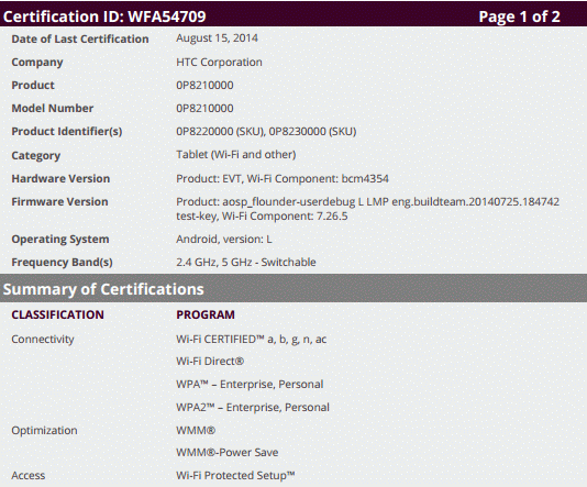 Если ориентироваться на сайт ассоциации Wi-Fi, то устройство с условным обозначением "0P8210000" производства HTC прошло сертификацию 15-го августа в категории "планшеты с поддержкой Wi-Fi". О характеристиках устройства из скупого описания, помимо поддержки различных диапазонов сетей Wi-Fi, ничего узнать невозможно.