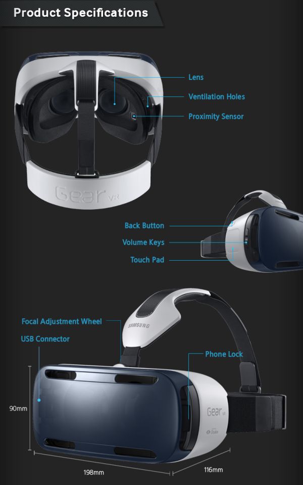 В минувшие выходные Samsung решила немного побаловать потребителей так называемой "инфографикой", поведав новые подробности о функциональных возможностях и характеристиках представленных на IFA 2014 устройств. Стало известно, что Gear VR обеспечивает угол обзора 96 градусов, при этом виртуальный дисплей остаётся перед глазами пользователя при повороте на все 360 градусов. Сами очки Gear VR оборудованы вентиляционными отверстиями, двумя линзами, датчиком приближения, колёсиком для изменения фокусного расстояния, кнопками изменения громкости, сенсорной панелью на боковой части корпуса, кнопкой возврата и USB-разъёмом. Сама "маска" с линзами имеет габаритные размеры 90 х 116 х 198 мм.