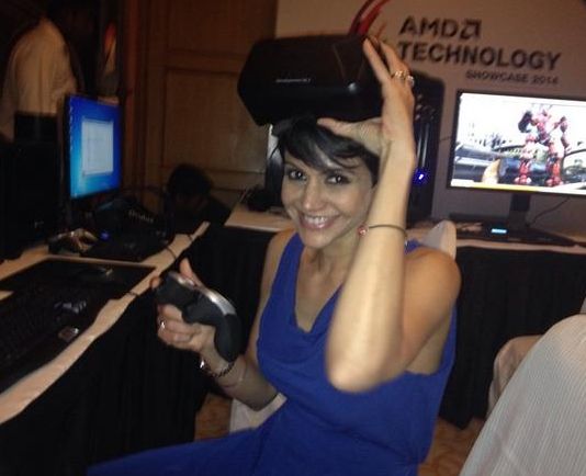 Однако, не обошлось и без сюрпризов. Например, в Индию AMD привезла шлем виртуальной реальности Oculus Rift (версию 2.0 для разработчиков), опробовать который в деле могли все приглашённые на мероприятие.