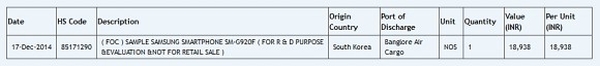 Сегодня в базе данных местного веб-сервиса Zauba, занимающегося отслеживанием экспортных и импортных операций на территории Индии, был замечен флагманский смартфон Samsung Galaxy S6. Аппарат с модельным номером SM-G920F прибыл для последующего тестирования из Южной Кореи в Индию 17 декабря 2014 года. Стоимость тестового экземпляра составляет 18 938 рупий (около $300) и, надо полагать, что розничная стоимость нового флагмана будет как минимум в два раза выше.
