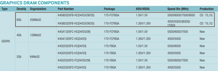 Коллеги с сайта VR-Zone удосужились пояснить, почему в случае с GeForce GTX 970 и GeForce GTX 980 дело не дошло до выпуска вариантов с 8 ГБ памяти типа GDDR5. Как они выяснили, производители памяти до сих пор не предлагали подходящих микросхем, которые могли бы и работать на частотах около 7 ГГц QDR, и набирать желанный объём минимальным количеством микросхем. В частности, компания Samsung соответствующие микросхемы типа GDDR5 начнёт поставлять в виде образцов только в текущем квартале: