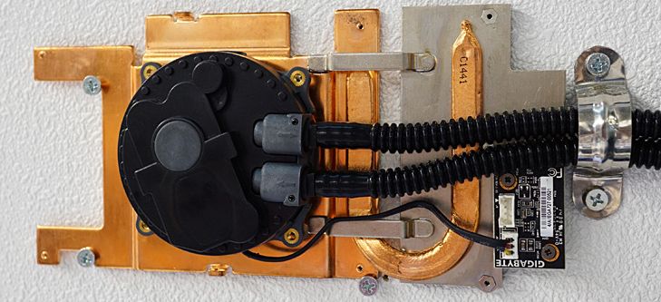 Впервые вниманию публики был представлен водоблок, обычно скрывающийся за сетчатым кожухом. Медное основание водоблока покрывает микросхемы памяти, а дополнительная секция, контактирующая с силовыми элементами, соединяется с основанием при помощи тепловой трубки.