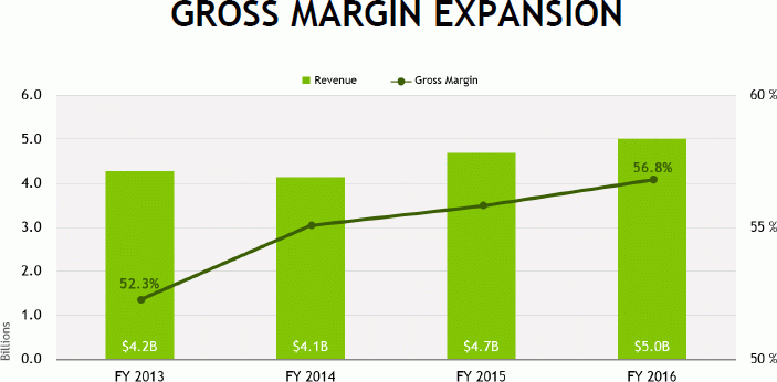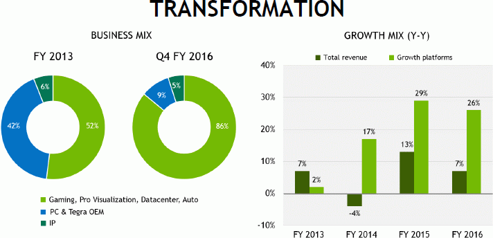 Например, в игровом сегменте средний темп прироста выручки за три года – около 30% в год. Серверные решения вроде ускорителей вычислений и специализированных кластеров растут на 7% в год, а автомобильный бизнес – на 80% в год. Норма прибыли при этом стабильно повышается.