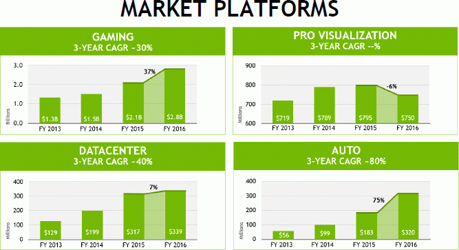 Около 86% выручки NVIDIA сейчас получает от четырёх направлений деятельности: игровые решения, профессиональная графика, центры обработки данных и автомобильная электроника. И растёт выручка на этих направлениях опережающими темпами.