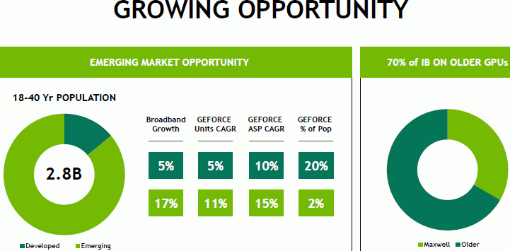 В каких сегментах рынка NVIDIA наблюдает потенциал роста? Если говорить об игровых решениях, то прицелы безжалостных маркетологов ориентированы на относительно молодую аудиторию любителей игр в странах с растущей экономикой. В мире насчитывается не менее 2,8 млрд. людей в возрасте от 18 до 40 лет, которым могут быть интересны компьютерные игры. При этом 70% пользовательской базы сидит на видеокартах прежних поколений – эпохи "до Maxwell".