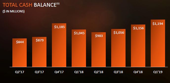 Когда Лизу Су (Lisa Su) на этом приёме спросили о приоритетах в финансовой политике компании, она пояснила, что зарабатываемые средства компания тратит, прежде всего, на финансирование текущих потребностей бизнеса, и во вторую очередь – на обслуживание долговых обязательств. В первом квартале компании удалось существенно сократить свой долг, он теперь не превышает $1,363 млрд, это минимальное значение за полтора года.