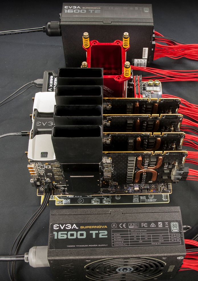 На этот раз K|ngp|n взял в руки четыре видеокарты GeForce GTX 1080 Ti "имени себя", оснастил их резервуарами для жидкого азота, которые выпускает основанная им компания, и подключил к этому квартету два блока питания EVGA мощностью по 1600 Вт каждый.