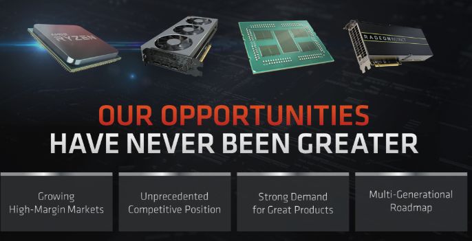 В конце своего выступления Лиза Су продемонстрировала слайд, описывающий конкурентное положение AMD исключительно в оптимистичных тонах. Никогда ещё перед компанией не открывались такие возможности, как гласит самая крупная подпись. Она увеличивает свою выручку на рынках с высокой доходностью, её продукты пользуются высоким спросом, а планы развития продуманы на несколько поколений вперёд.