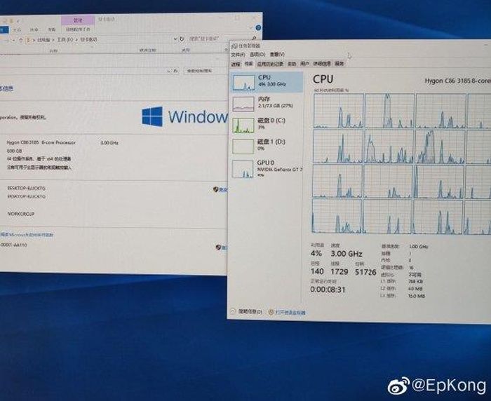 Один из пользователей Weibo недавно поделился снимком экрана скромного качества, на котором демонстрировалась способность процессора Hygon C86 3185 работать в Windows 10 с сохранением активности восьми ядер и 16 потоков при частоте 3.0 ГГц в состоянии покоя. Такой процессор предлагается в составе готовых компьютеров на китайском рынке, в его характеристиках упоминается способность покорять частоту 3.6 ГГц при активности четырёх ядер. Скорее всего, с меньшим количеством активных ядер процессор способен работать на частоте 3.8 ГГц.