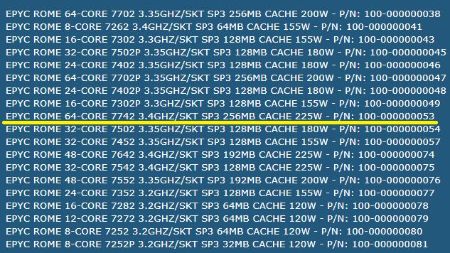 Флагманская модель EPYC 7742, как можно понять из списка, будет сочетать максимальную частоту 3.4 ГГц и уровень TDP не более 225 Вт. Для процессора с 64 вычислительными ядрами не самое плохое сочетание характеристик.