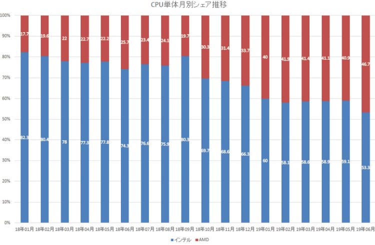 Если разбивать статистику по неделям, то в период с восьмого по четырнадцатое июля процессоры AMD формировали до 68,6% объёмов продаж в японской рознице. Это исторический максимум, хотя средневзвешенная доля за июль может превысить 50-процентный рубеж не так заметно. По итогам июня, например, она не превышала 46,7%.