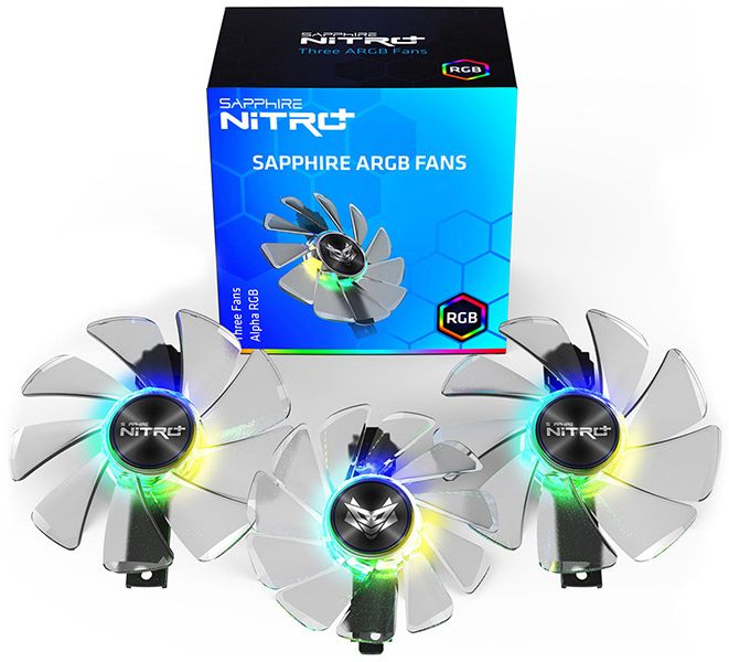 Вентиляторы подойдут исключительно к видеокартам серии Nitro+, два из них имеют диаметр крыльчатки 95 мм, один – 87 мм. Все три оснащаются управляемой светодиодной подсветкой типа ARGB и двухрядными шарикоподшипниками с повышенным ресурсом. Для работы с подсветкой достаточно фирменной программы Sapphire TriXX.