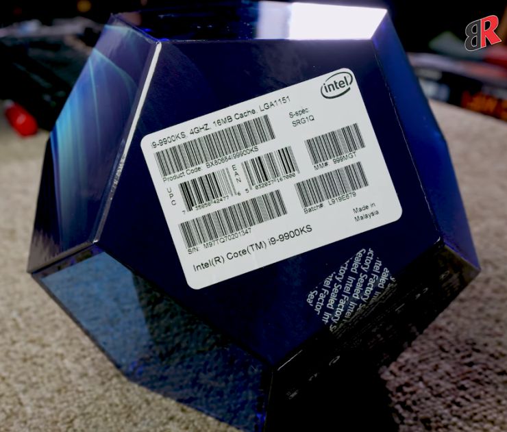 Фотографии ярлыка на одной из граней додекаэдра позволяют нам узнать, что процессор Core i9-9900KS работает на базовой частоте 4.0 ГГц и носит маркировку вида SRG1Q.