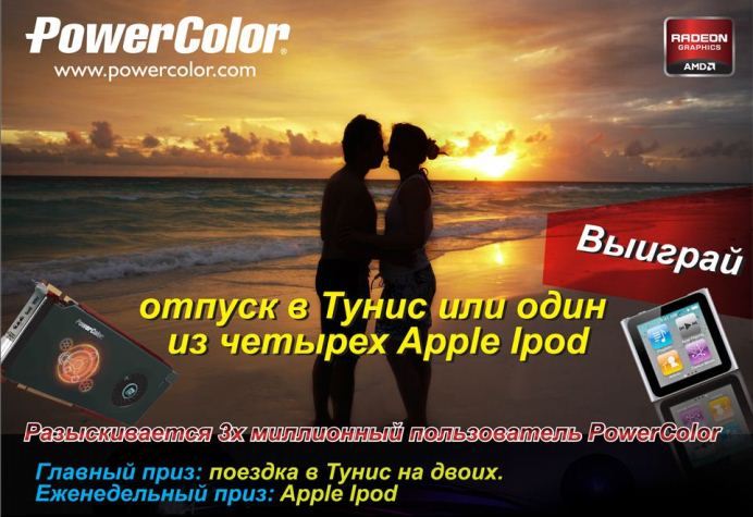 PowerColor не перестает удивлять игроков всего мира своими отличными продуктами в области графики, и все это происходит не без помощи фанатов наших видеокарт. Мы очень часто получаем от вас положительные отзывы о нашей работе, и теперь у нас появилась возможность отблагодарить вас за поддержку, которую вы нам оказываете! Мы ищем счастливчика под номером 3 000 000 и дарим ему поездку в Тунис на двоих!
