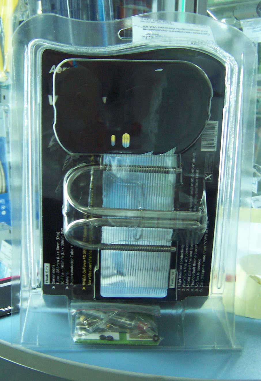 Этакая "тёмная лошадка" от довольно известного производителя. По крайней мере, выглядит симпатично, и тепловые трубки ориентированы относительно платы не как у всех. Плохо это или хорошо – скоро узнаем. Не скажется ли отрицательно на охлаждении тот факт, что отсутствуют хоть какие-то рёбра со стороны чипа видеокарты? Поставляется в традиционной для компании Aerocool упаковке: