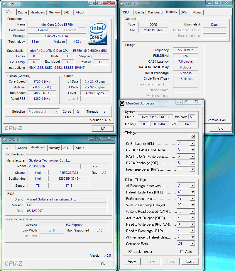 Для тестов в данном случае мы решили использовать тот же самый процессор Core 2 Duo E6750, но разогнанный до своей предельной частоты (с применением воздушного охлаждения), которая составляет 3.72 ГГц для нашего экземпляра CPU. Эта частота выставлялась как 8 x 465 МГц, для достижения полной стабильности напряжение питания процессора повышалось до 1.45 В.
