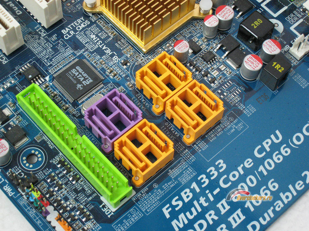 Микросхемы чипсета на недорогой плате Gigabyte P35C-DS3R охлаждаются обычными пассивными радиаторами из алюминия, окрашенными в золотистый цвет. В принципе, их вполне хватает для отвода тепла от северного и южного моста, но всё-таки эти микросхемы достаточно сильно нагреваются при работе. Поэтому, при желании радиатор северного моста можно заменить или снабдить вентилятором. Что же касается южного моста, то поскольку этот чип в собранной системе попадает под видеокарту, придумать что-то для его более эффективного охлаждения будет несколько проблематично.