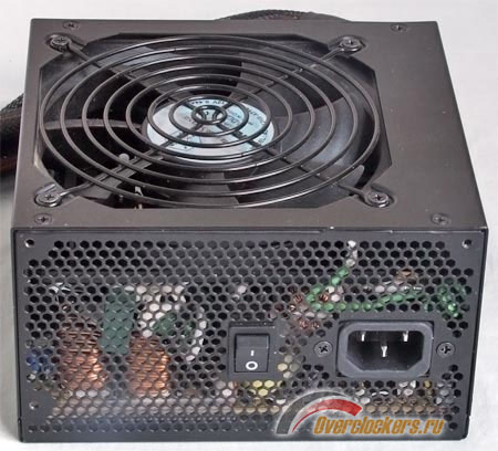 Тыльная сторона также ничего необычного не содержит, традиционные вентиляционные соты с не менее традиционными силовым разъемом и выключателем. Вентилятор источника смещен относительно центра, подобная компоновка встречалась нам в блоке OCZ GameXStream на базе платформы FSP Epsilon.