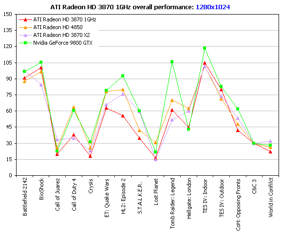 Разогнанный до 972 МГц по ядру ATI Radeon HD 3870 лидирует в двух разрешениях из трёх, что можно назвать великолепным результатом, если бы не низкая минимальная производительность, обусловленная, по всей видимости, весьма неудачной архитектурой текстурных процессоров ATI Radeon HD.