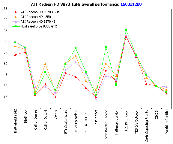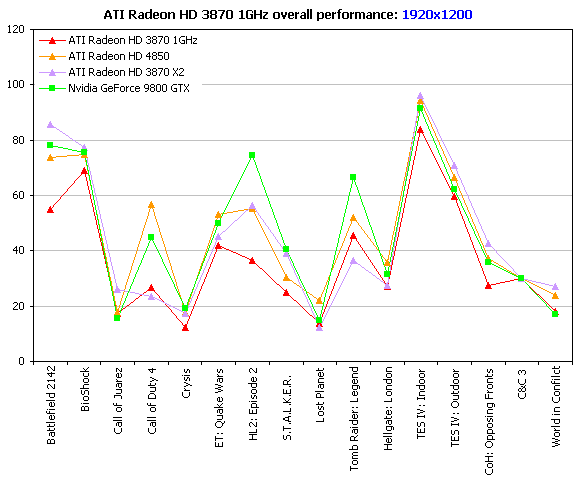 К сожалению, даже экстремальный разгон не позволил ATI Radeon HD 3870 достичь уровня хотя бы Nvidia GeForce 9600 GT; хотя отставание составило всего 5%-6% в разрешении 1920х1200. В этом же разрешении полученный прирост скорости оказался достаточным для обеспечения комфортной игры. Разумеется, в последнем случае, речь идёт о гипотетическом ATI Radeon HD 3870, способном работать на таких частотах длительное время без перегрева, опасности выхода из строя и с приемлемым уровнем шума.