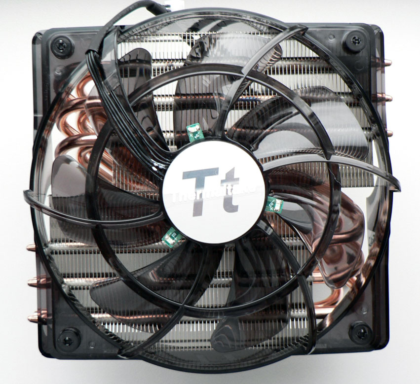 Размеры каждой из секций составляют 115 х 70 х 27.5 мм. Расчётная площадь радиатора равна примерно 5080 см2. Для сравнения у Thermalright SI-128 SE расчётная площадь радиатора ~6786 см2. Вообще, странно почему инженеры из Thermaltake не стали увеличивать площадь радиатора, ведь внизу ещё предостаточно места, да и у всё того же Thermaltake Big Typhoon (120 VX) пластины шире. Добавлю здесь, что контакт пластин и тепловых трубок осуществлён пайкой.