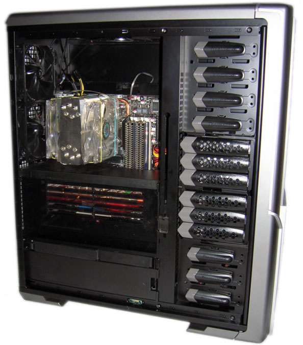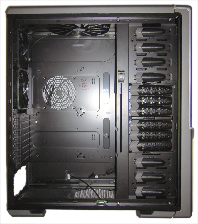 Спереди находится стойка под устройства 5,25”. Всего корпус наделен семью внешними отсеками 5,25” , из них три находятся снизу и еще четыре сверху. Один из них можно конвертировать во внешний 3,5”-ый отсек с помощью металлического переходника и заглушки из комплекта. Между ними находятся шесть внутренних 3,5”-ых отсеков, которые заняты корзинами под жесткие диски.