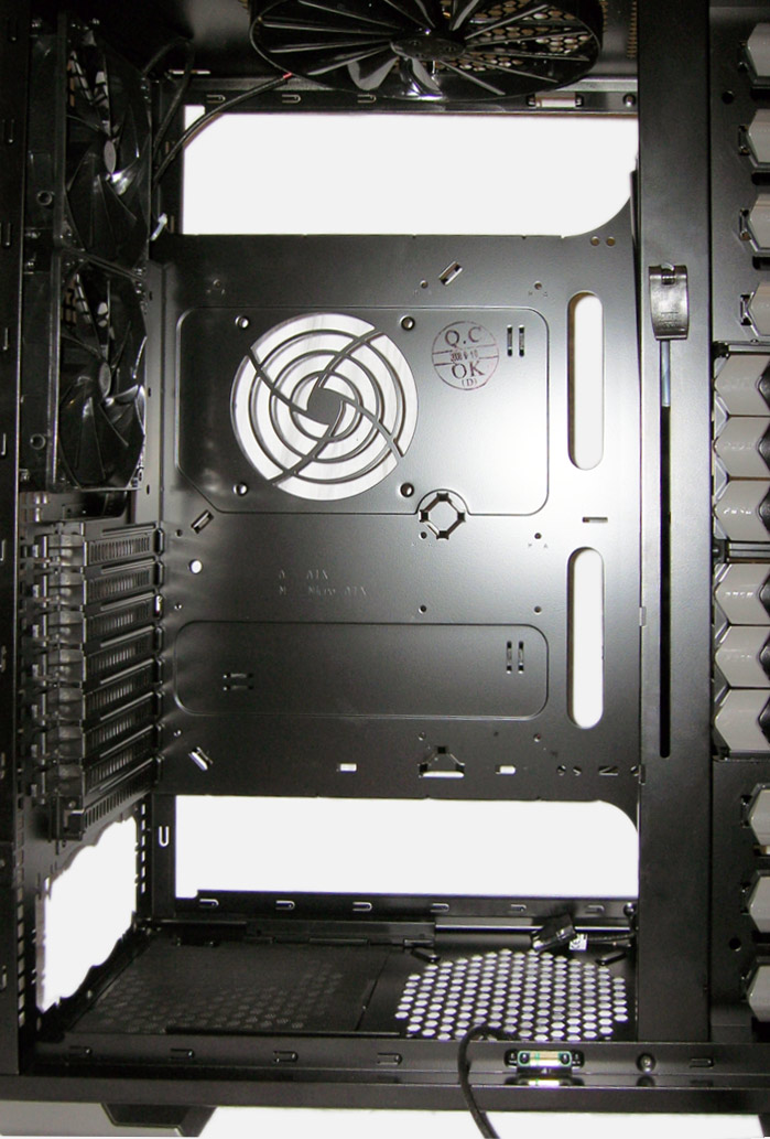 Нутро корпуса выкрашено в черный свет в тон внешней части, что положительным образом сказывается на внешнем виде. Внутренний объем корпуса большой, однако, половина его закрыта пластиковыми перегородками и заглушками.