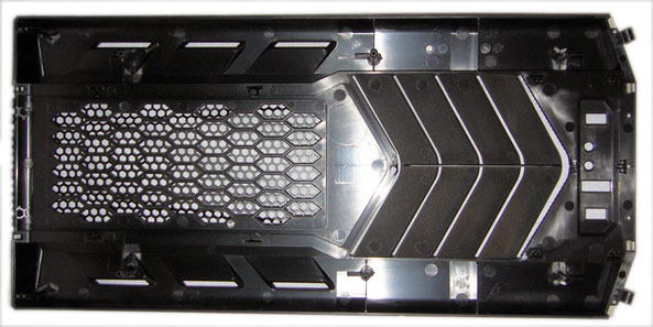 В днище корпуса находятся две больших вентиляционных решетки: одна для вентилятора блока питания, а вторая, на случай, если снизу будет установлен дополнительный 120мм вентилятор.