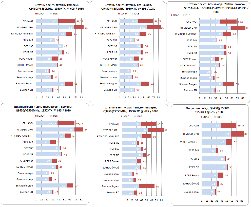 Как мы видим, деление на камеры в штатной комплектации не дает преимущества перед вариантом без камер. Какие-то температуры немного выше, какие-то ниже. Вариант без камер значительно выиграет лишь в охлаждении элементов питания видеокарты. Это неудивительно, так как в случае с камерами воздух от бокового 200мм-ого вентилятора поступает к видеокарте лишь через прорези в кожухе, в то время как без заглушек ничто не мешает воздушному потоку. Давайте теперь попробуем отключить боковой 200мм-ый вентилятор, чтобы оценить его вклад в охлаждение системы: