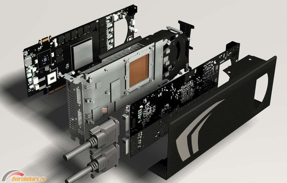 Видеокарта GeForce GTX295 попала к нам в тестовую лабораторию под брендом Palit, который «славится» опечатыванием болтиков системы охлаждения, что не дает возможности бесследно разобрать видеокарту, поэтому воспользуемся 3D-моделью «бутерброда» GTX295: