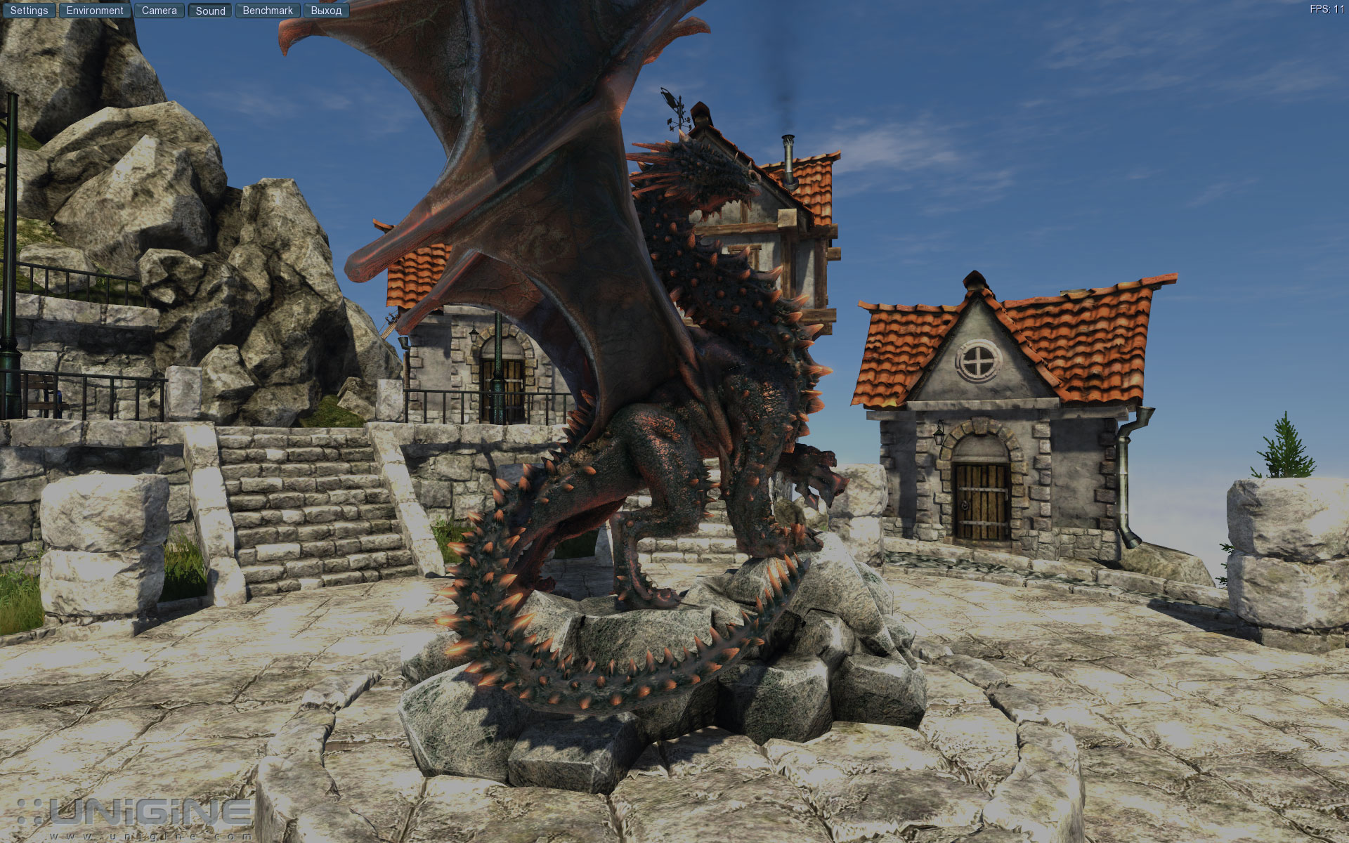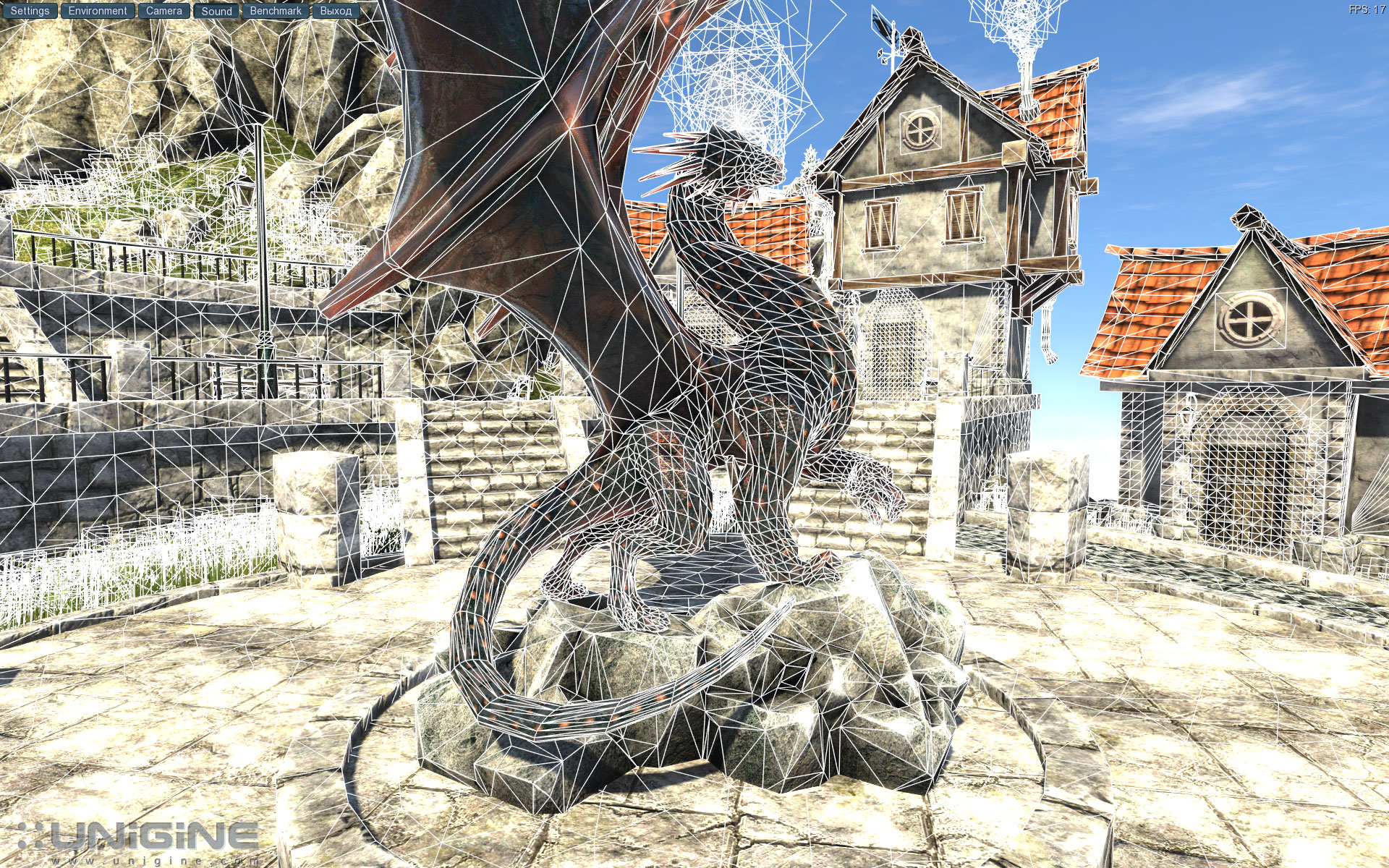 Даже при беглом взгляде первое, что бросается в глаза, это совершенно разная детализация моделей. Как вы уже догадались, сверху у нас скриншот, снятый при отключенной тесселяции, снизу - при включенной. Обратите внимание на детализацию дракона, поверхность стала намного более объемной. То же самое можно сказать и про все остальные объекты. Чтобы увидеть, за счет чего так сильно меняется картинка, в настройках бенчмарка есть возможность включить сетку отображения полигонов: