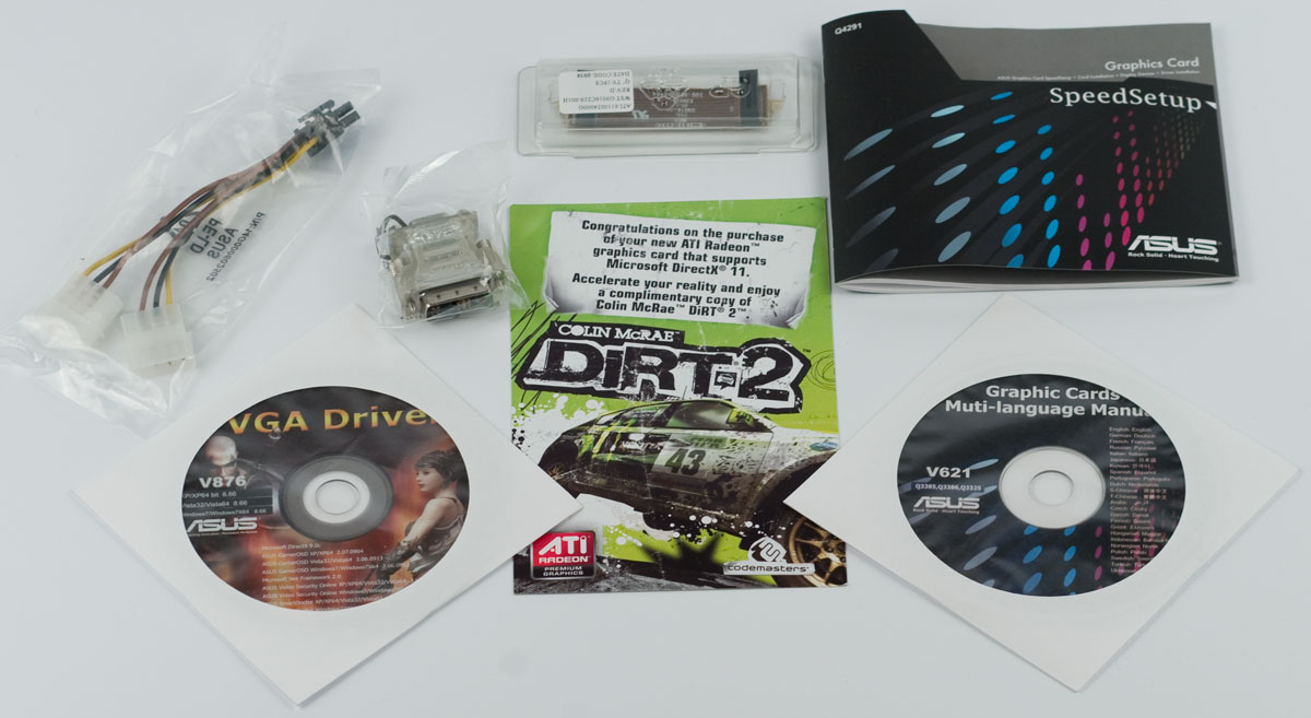 Два диска с ПО, инструкция по установке, активационный ключ для игры Colin McRae DIRT2, адаптер с двух "молексов" на один шестипиновый разъем питания, Crossfire-мостик и переходник c DVI на D-Sub.