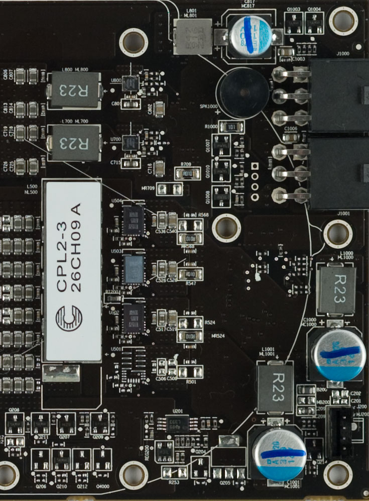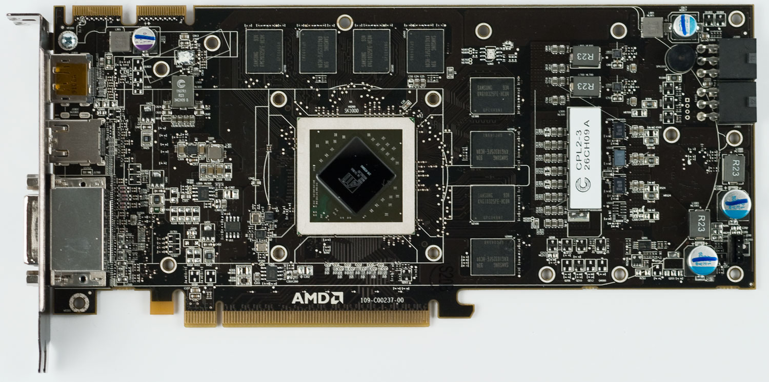 Дизайн печатной платы похож на оный у HD 5870, разве что пустых мест поменьше и подсистема питания поскромнее - в ней теперь три фазы вместо четырех у HD 5870 (...но и тут не обошлось без пустующих площадок под силовые ключи):