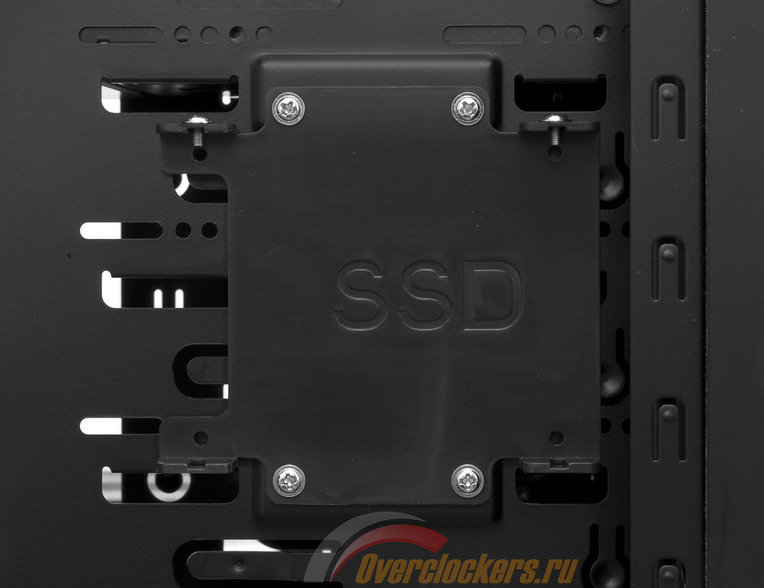 И в довершение истории про монтаж жестких дисков упомянем про штатное крепление для 2.5”-устройства в тестируемом корпусе. Твердотельный накопитель (Solid State Drive) или мобильный жесткий диск прикручивается к комплектной пластине, а уже она в свою очередь – к направляющей пятидюймовых отсеков с обратной стороны FT02. Выглядит это следующим образом: