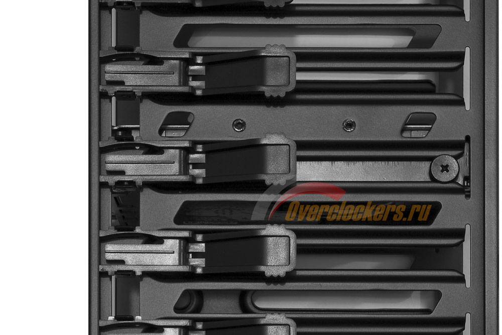 И отдельный объем (условно, конечно, ведь все перегородки в корпусе весьма «дырявые») занимает корзина для жестких дисков. Она рассчитана на семь винчестеров и, т.к. из-за этого получилась весьма высокой, имеет в средней части дополнительное ребро жесткости.