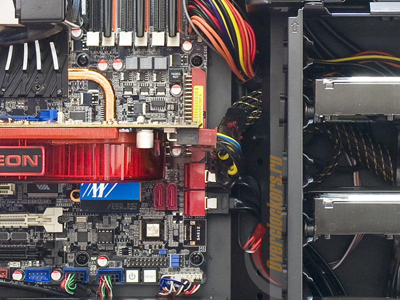 Они расположены со стороны видеокарт, так что в большинстве случаев для (де-)монтажа жестких дисков извлекать саму корзину не придется.