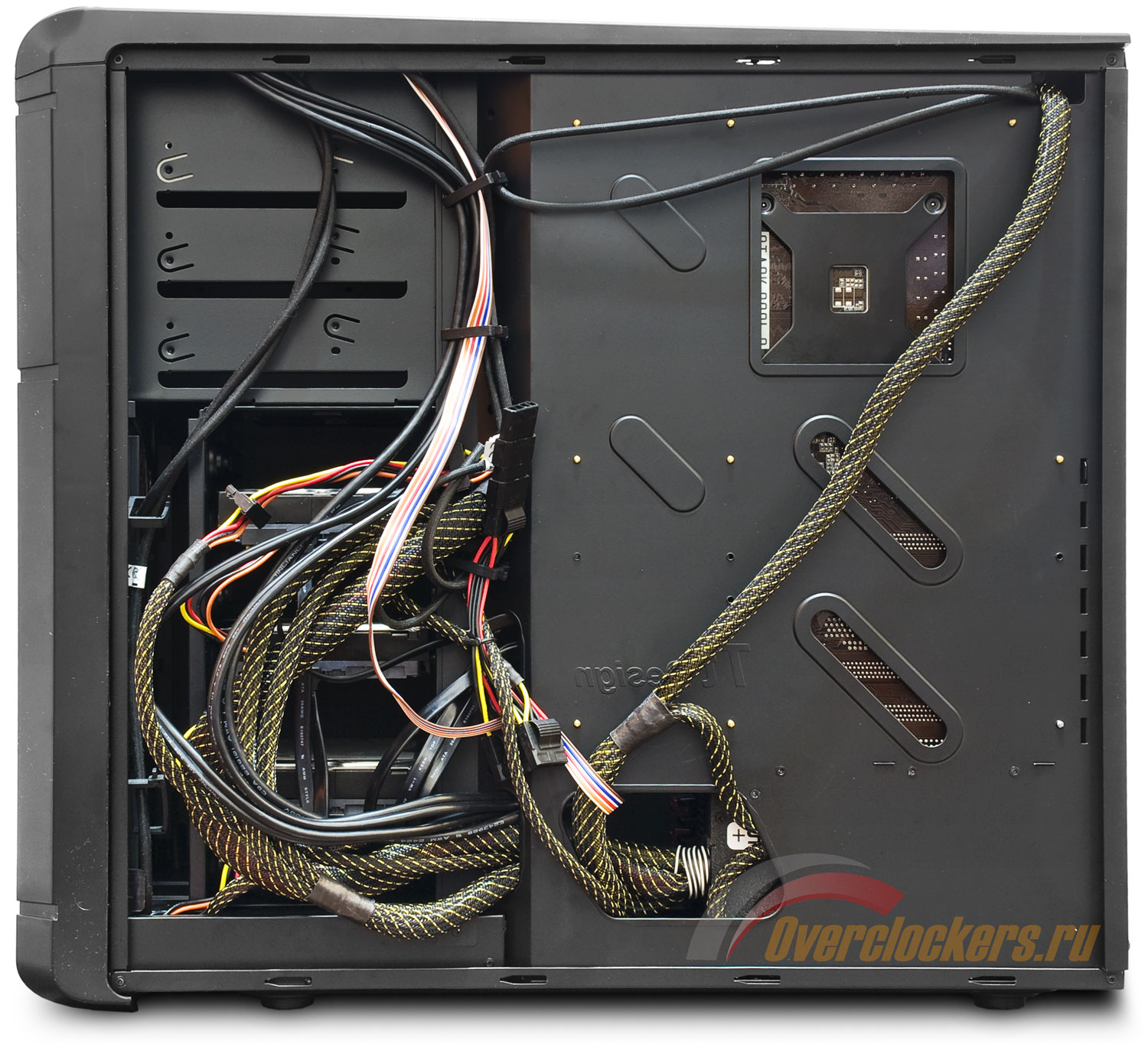 И этой возможностью наверняка придется воспользоваться, даже несмотря на то, что корпус предлагает систему организации кабелей, подразумевающую их прокладку за поддоном. А все потому, что ме́ста по ширине там лишь около сантиметра. Даже с теми несколькими миллиметрами, которые добавляет выштамповка боковой панели, этого все равно вряд ли хватит, чтобы упрятать за поддон толстые шлейфы блока питания в жесткой оплетке.