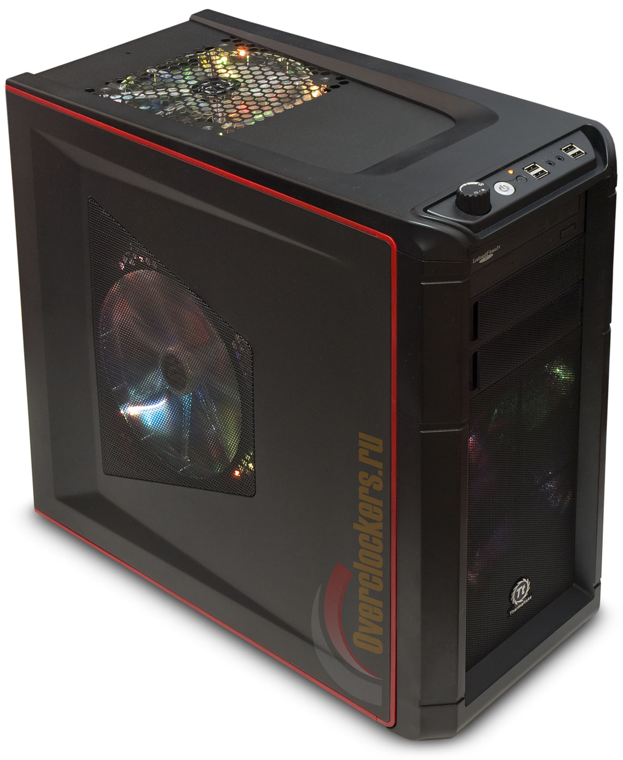 Но без «интересностей», понятное дело, не обошлось. Неплохо оживляют скучный черный ящик ярко-красные полосы по периметру боковых панелей, а также крупная «шишка» регулятора оборотов штатных 200 мм вентиляторов сверху слева. Эта шайба также ответственна за переключение режимов работы подсветки вентиляторов и ее отключение. Рядом с нею на небольшой панельке, «сточенной» с верхнего переднего ребра Element G, расположились и все остальные элементы управления корпуса.