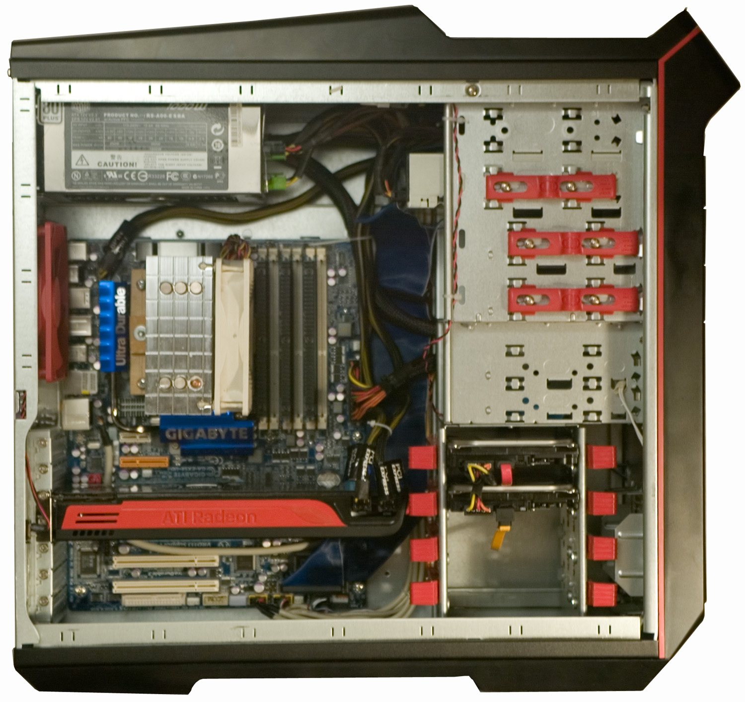 Места в корпусе много, поэтому проблем с установкой матплаты и блоком питания не было. Немного озаботило то, что БП частично перекрывал воздшный поток к верхнему вентилятору. Возможно, это скажется на охлаждении системы в целом. Так же с лихвой хватило места для подключения 8-ми пинового разъема дополнительного питания процессора, привода и жестких дисков...