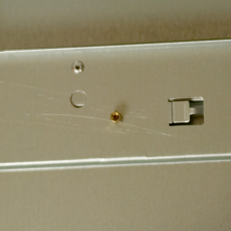 Правая боковая стенка несъемная, выполнена из стали с черным порошковым покрытием. Левая съемная, с декоративным окном, сделанным из прозрачного плексигласа (сиречь оргстекла) и закрепленного пластиковыми заклепками. Фиксирование ее на шасси осуществляется при помощи двух винтов с «ополимеренными» накатанными головками брутально-чОрного цвета. Дверца закрывается на замок, а замок, в свою очередь, на ключ. Правда, ключи, как и всю фурнитуру, кто-то благополучно «пролюбил». Но как бы то ни было, отсутствие ключей на функциональность не влияет и стенка открывается просто: достаточно легко потянуть пальцем ручку на себя (естественно, предварительно отвернув винты).