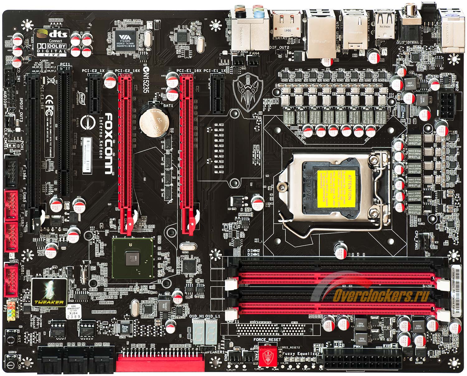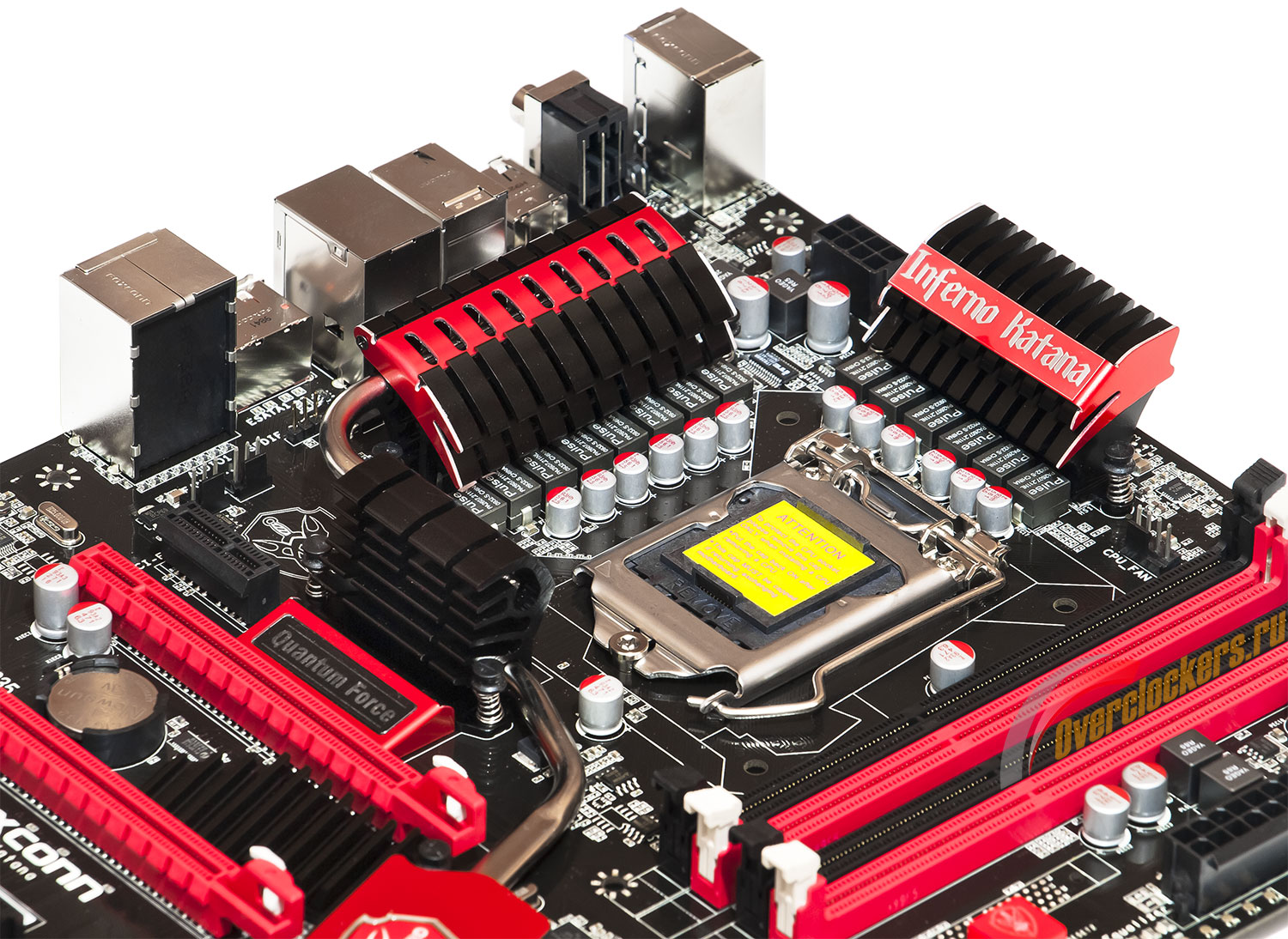 Дизайн Foxconn Inferno Katana выдает острое желание разработчиков сделать максимально «круто» выглядящую плату. Как известно, набор логики Intel P55 Express состоит из одной микросхемы (она играет здесь роль южного моста), поэтому второй радиатор в центре материнки здесь в принципе не нужен.