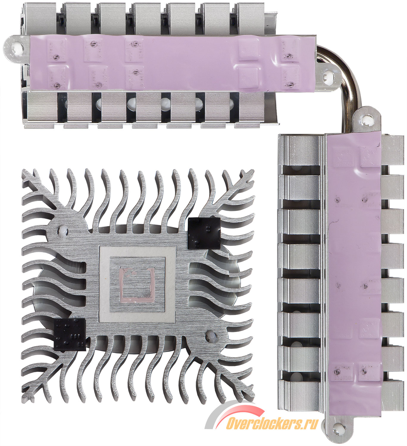 Угловую, в форме буквы «Г» конструкцию образуют радиаторы, призванные охлаждать элементы процессорного преобразователя питания. Они соединены шестимиллиметровой тепловой трубкой.