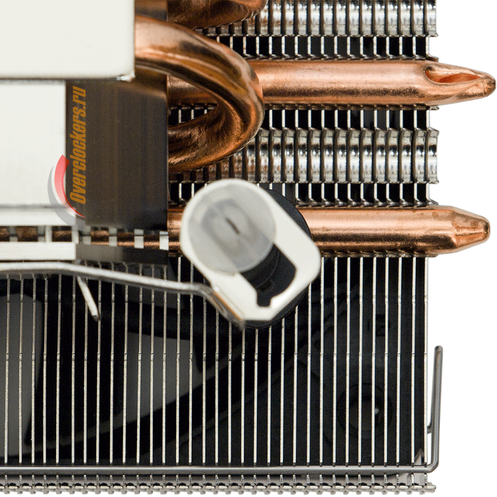 Он представляет собой типичную систему охлаждения топ-конструкции (с «вертушкой», расположенной параллельно материнской плате). За перенос тепла от основания к рассеивающим пластинам здесь отвечает четверка шестимиллиметровых тепловых трубок.