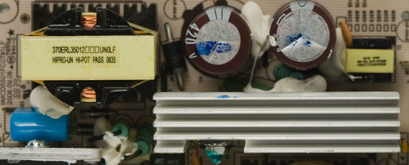Даже пассивный PFC отсутствует (об этом свидетельствуют пустующие отверстия винтов крепления дросселя рядом с этикеткой).