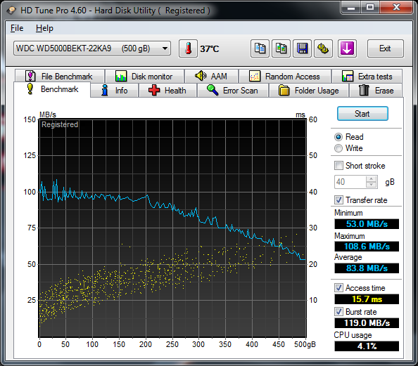 Бесспорно, накопитель – очень быстрый. Это видно при работе за ноутбуком (загрузка Windows, запуск приложений), так и по результатам тестов (средняя скорость чтения 83,8 Мбайт\с, время доступа – 15,7 мс). Не зря компания Western Digital описывает это HDD словами – “Desktop-class performance for notebook computers” в переводе на русский так красиво не получится :)