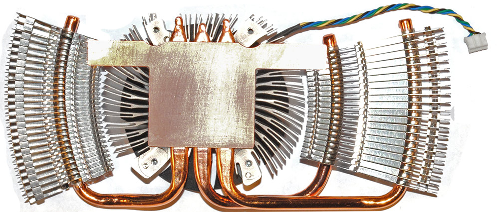 Интересная конструкция, которая внешне напоминает какой-то сумасшедший вертолет в стиле «стимпанк». Но, опустив сравнения, гораздо важнее, что в основе системы лежат три тепловые трубки диаметром 6 мм. Одна из трубок уходит в веерообразный радиатор возле задней панели видеокарты, две других – в похожий радиатор, расположенный «позади» вентилятора. Дополнительный округлый радиатор расположен прямо под крыльчаткой и смыкается с основанием. Конструкция здорово напоминает фирменную разработку MSI – так называемый Cyclone, только сильно уменьшенный в размерах. В одной из моих старых-старых статей было такое фото: