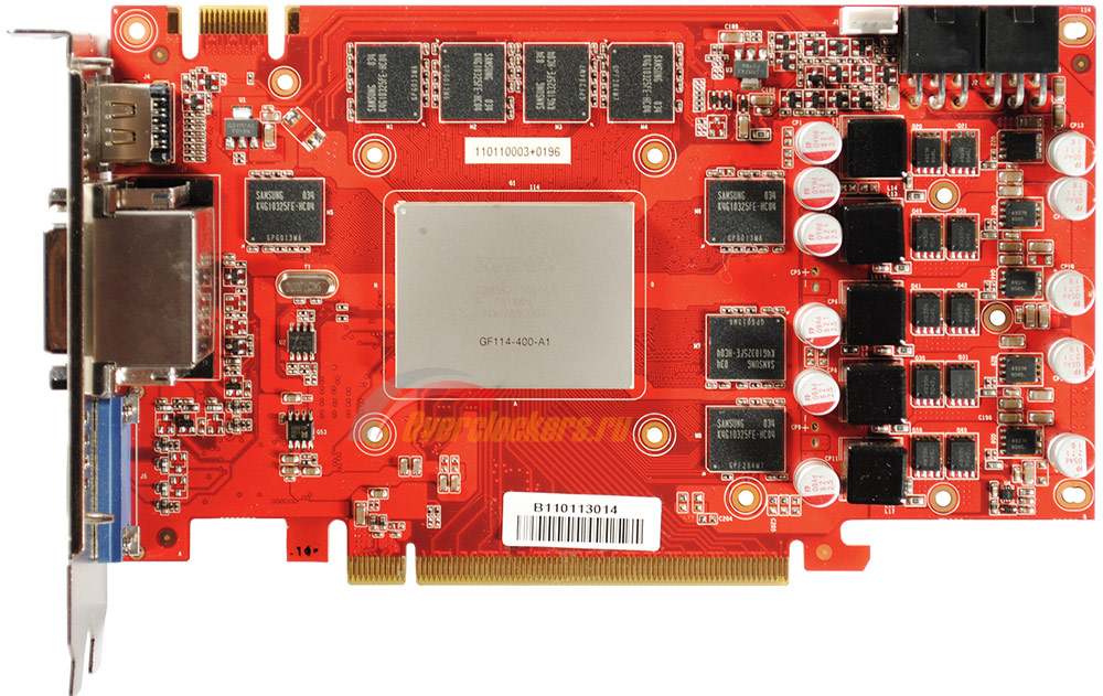 Если принять во внимание, что тестируемая видеокарта значительно короче эталонного образца, сразу становится понятно, что и печатная плата Gainward отличается от стандартной. Так и есть. Общий вид платы вы можете оценить на фото ниже.