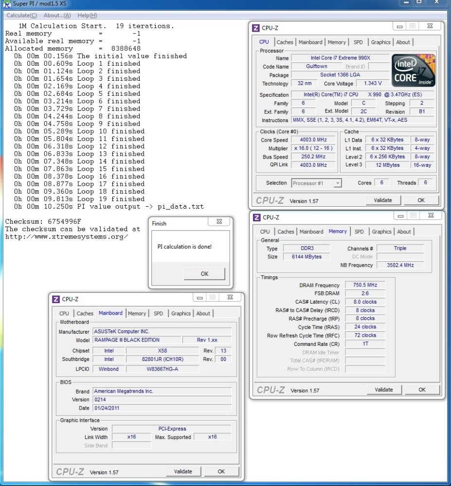 На частоте 250 МГц были пройдены тесты Super Pi 1M и 32M:
